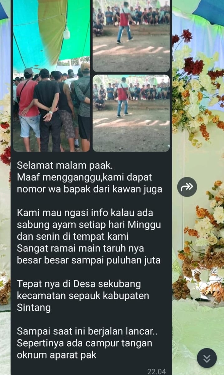 Laporan warga yang diterima redaksi media nasional pada Jumat malam (11/7) pukul 22.04 WIB melalui pesan singkat WhatsApp menyebutkan bahwa arena sabung ayam tersebut terus beroperasi dengan leluasa. Bahkan, warga menduga kuat adanya campur tangan atau pembiaran dari oknum aparat penegak hukum di wilayah Kabupaten Sintang.