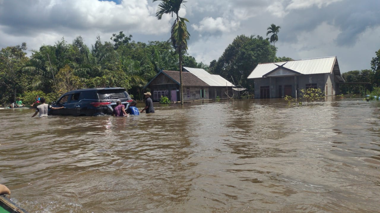 Air merendam pemukiman warga Desa Penopa, termasuk Jalan Negara Lintas Kalteng-Kalbar yang lumpuh menyebebkan antrian panjang kendaraan.